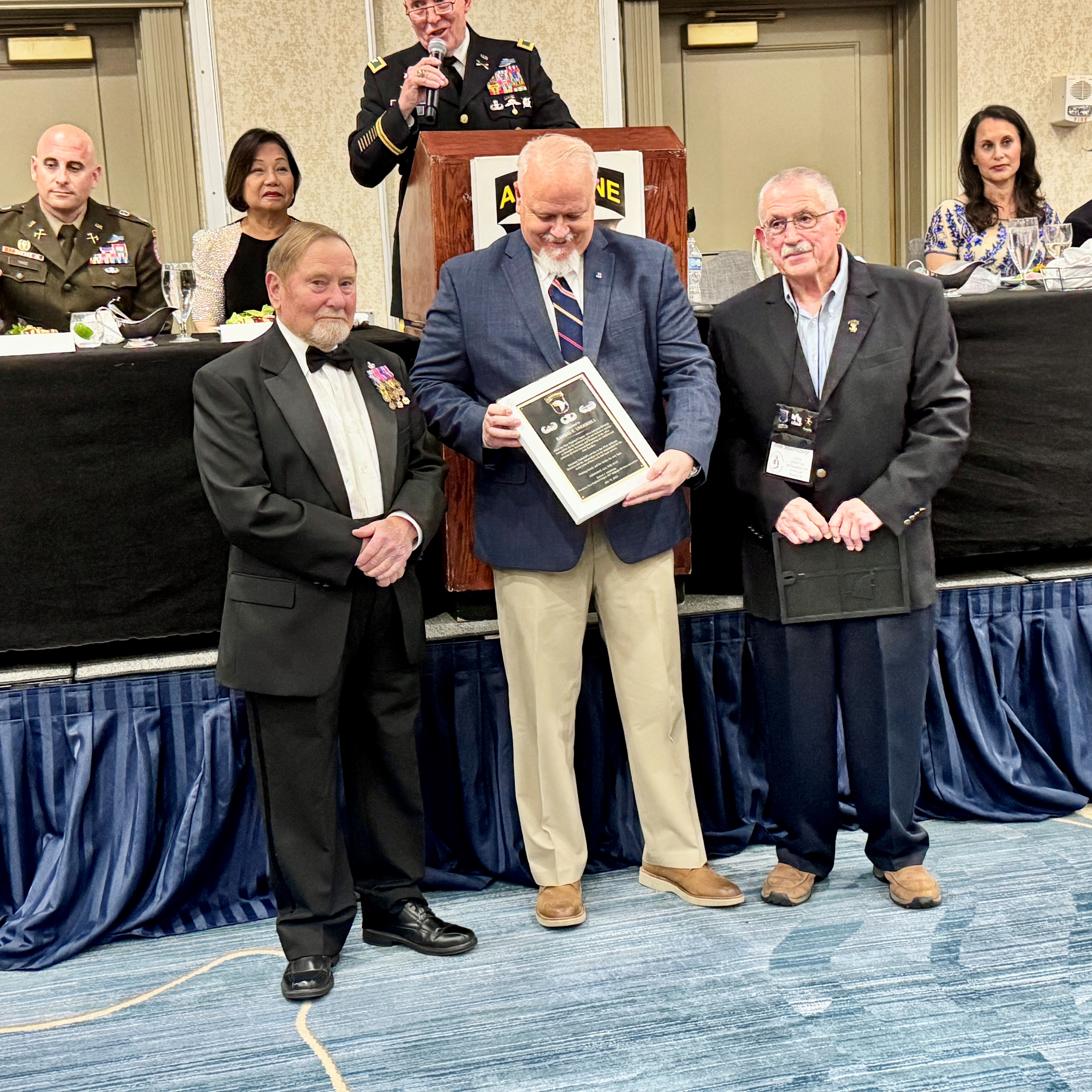 L-R: SAA Bill "Blink" Blankenburg, National ExecSec Randy Underhill, Chapter President Bob Morrissey. Bob reads the plaque text. |
