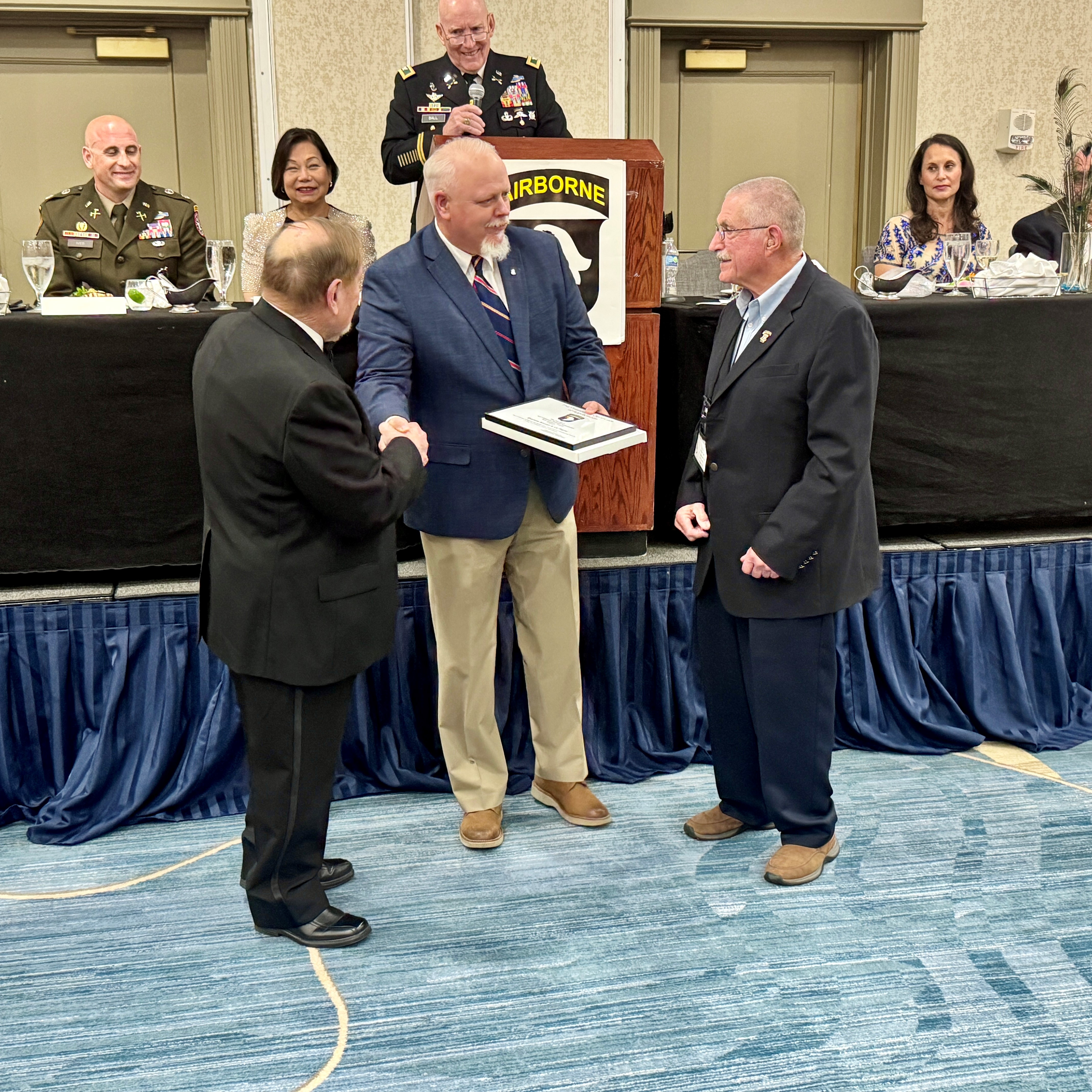 Our guest, Joe Landry, 82nd AB, WWII veteran, with Don Miller and Linda Magee |